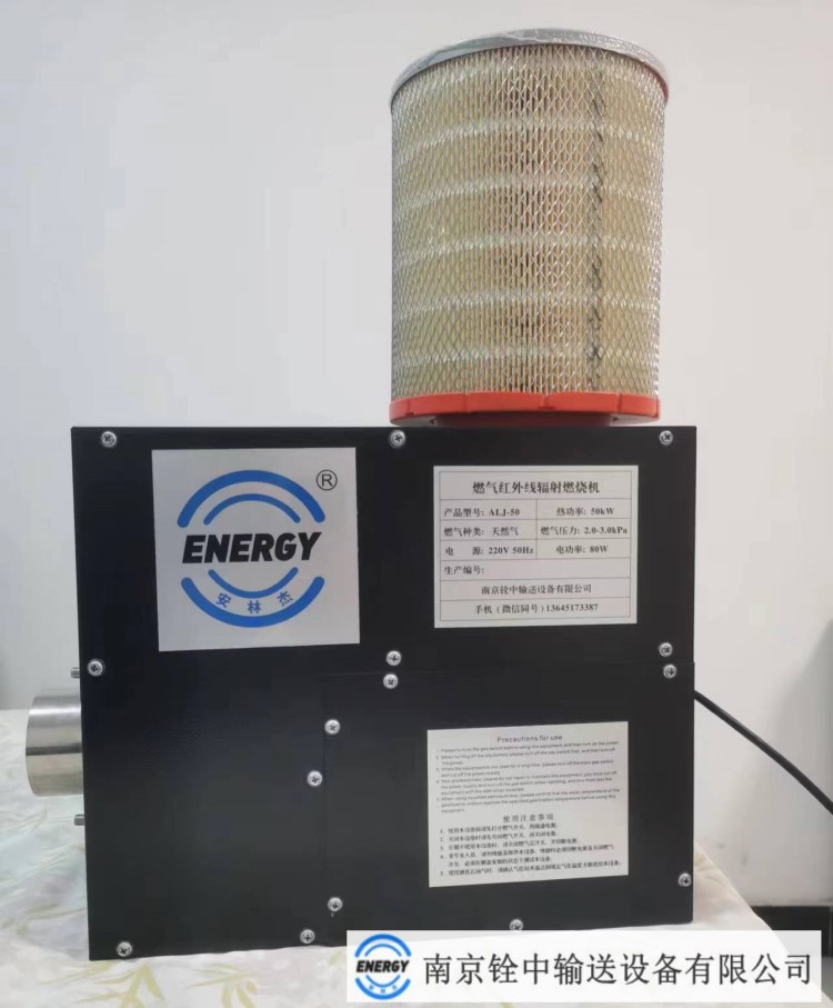 紅外線輻射燃燒裝置外置溫度傳感器感應到被加熱物體的溫度低于其預設溫度時,溫度傳感器將該信息傳送至程序控制器,程序控制器分別連通燃燒機的電源及風機的高風檔;外置溫度傳感器感應到被加熱物體的溫度大于或等于其預設溫度時,外置溫度傳感器將該信息傳送至控制器,控制器斷開燃燒機的開關并發(fā)出低風量供風指令給中間繼電器,中間繼電器接通低風檔以不停輸入小風量。